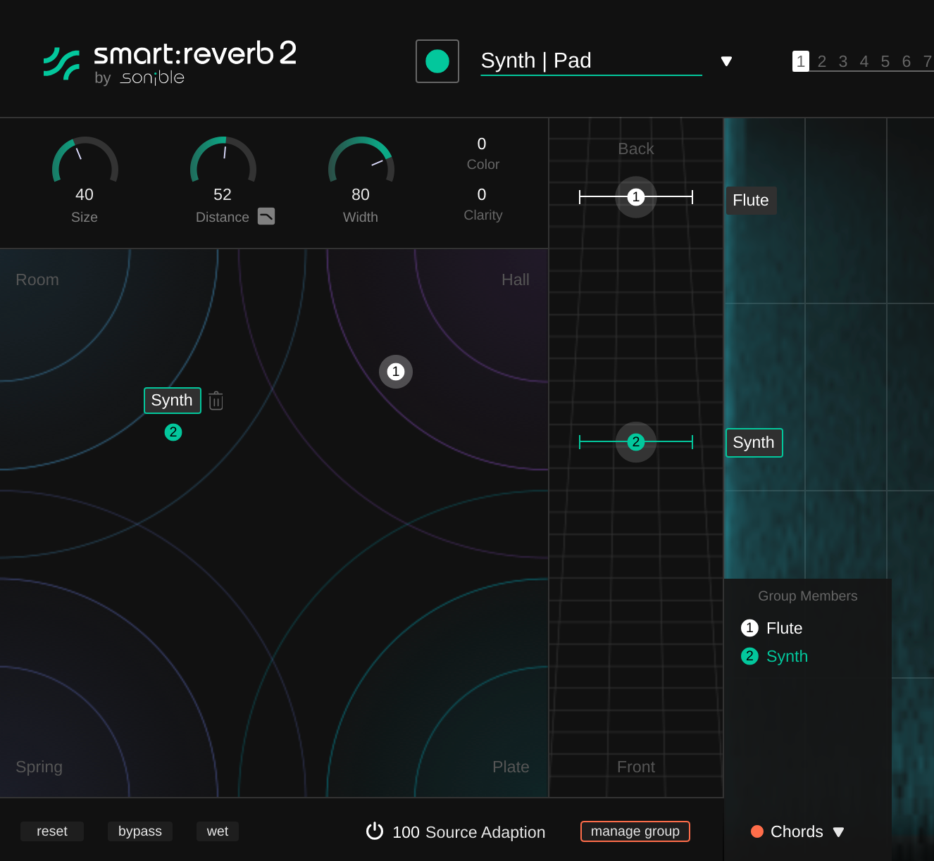 The synth layer can be moved into the middle position, partially using its Distance control again, but also by removing its highs but also by adding some reverb, this time set between a blend of room and spring.