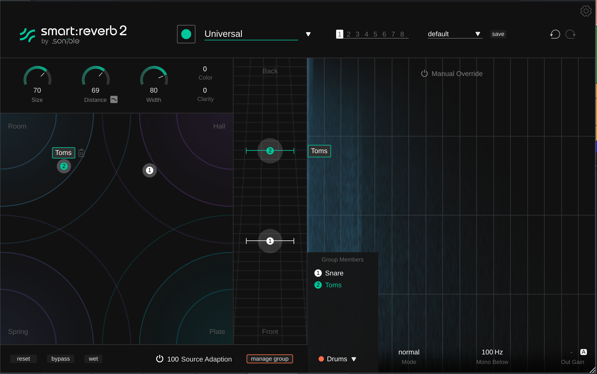 While the perception of depth in a mix relies on a few properties, with smart:reverb 2, it’s simple to dial in using just a single, intuitive parameter. And with inter-plugin communication, different instances on different mix channels swap information that helps make a clean, clear signal with no masking.