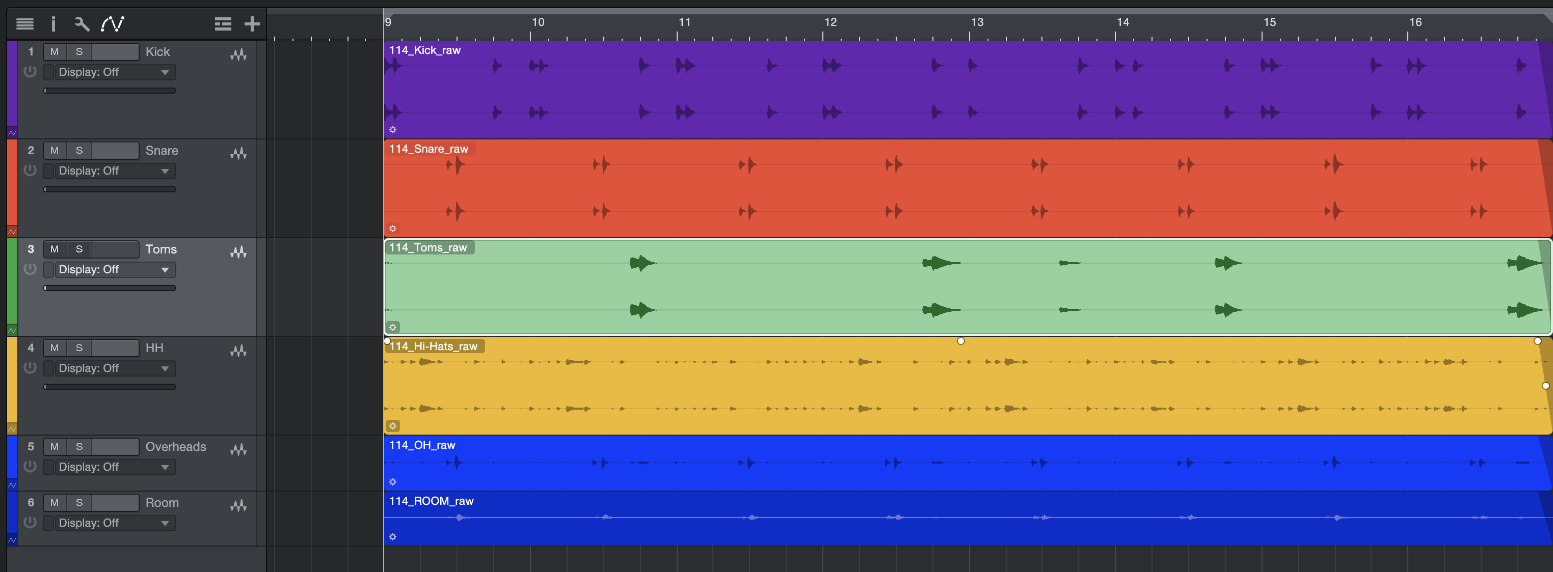 We have a kick, a snare, some hi-hats and a tom, as well as the overhead and room microphone recordings. Our mission here will be to make the snare upfront, push the kick and toms into the background, and leave the hi-hats in the middle – although their relative levels should have them all co-existing together.