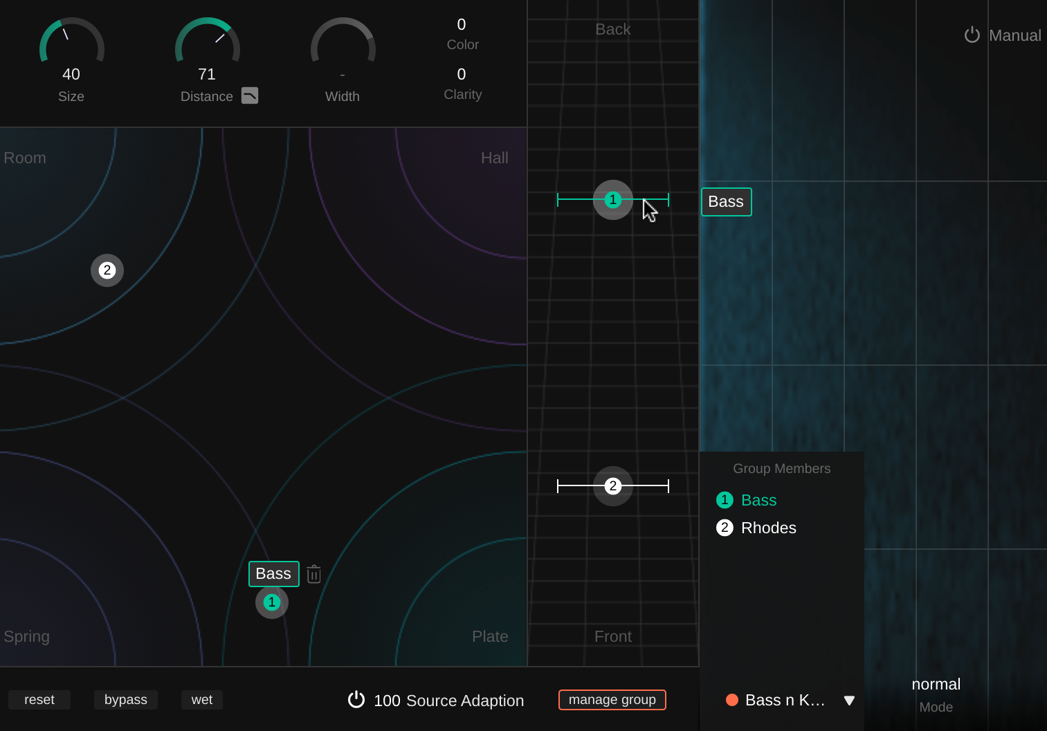 We load up smart:reverb 2 on both the bass track and the keys track. With each smart:reverb 2 instance, we analyze the content of the track, which lets the plugin generate an appropriate reverb response that’s tailored to the signal and the instrument. If we add both of the smart:reverb 2 instances to the same Group (which you can do from either plugin instance), the two instruments both appear on the vertical ‘Front to Back’ slider, where we can set their distances and their widths, while keeping things clean. This is all it takes to push one element further back and bring the other one more upfront. You can hear the result below.