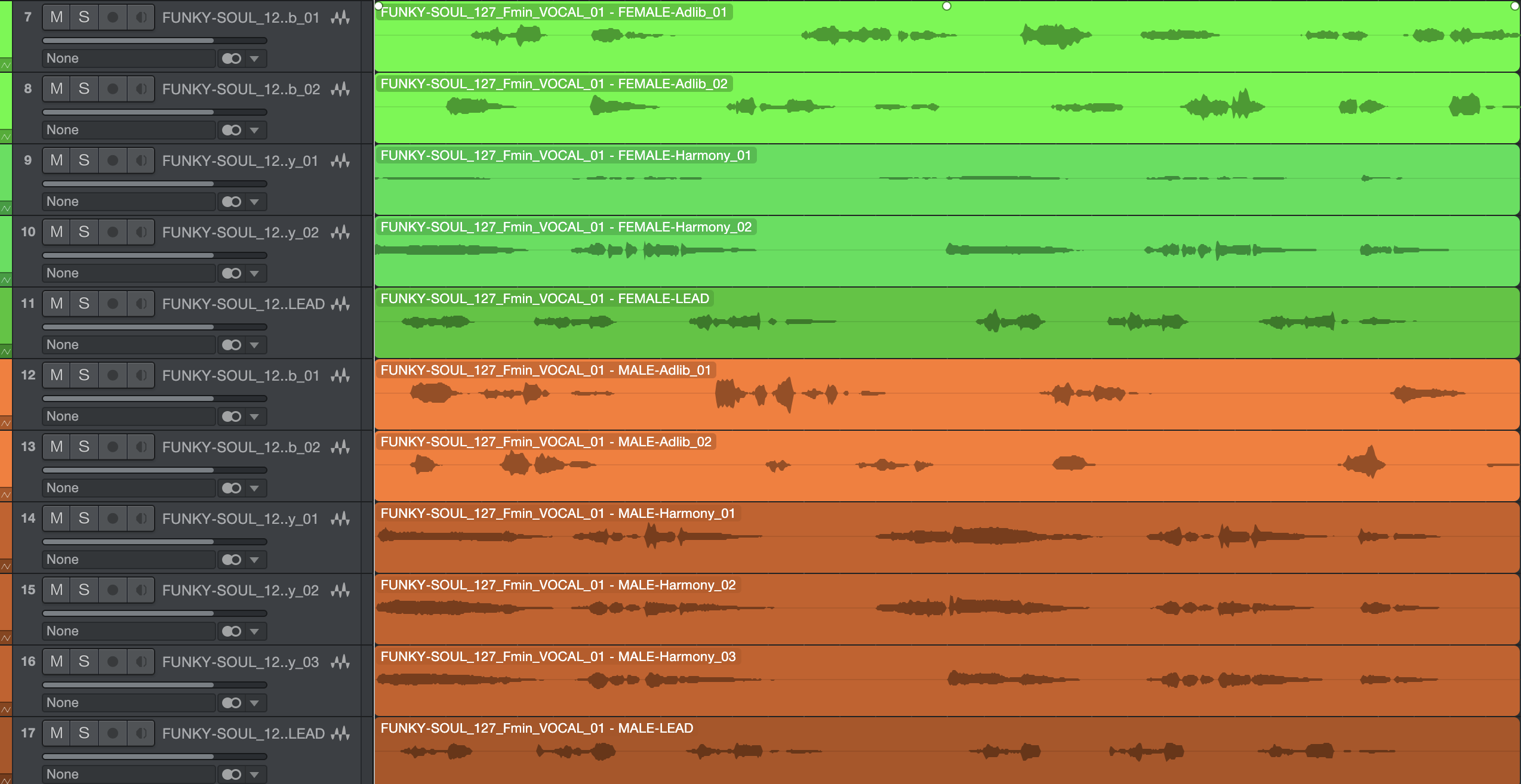 Next we move to a complicated arrangement of male and female vocals. Each has a ‘main’ vocal channel, two ad lib channels, and more than one harmony channel, but it’s not immediately obvious which is which, from listening to the unmixed tracks.We should help our listeners to grasp which voice to pay most attention to, and which to perceive as supporting elements. Depth is a great cue to give to help that. Here’s what the elements all sounded like together when first imported into a project.