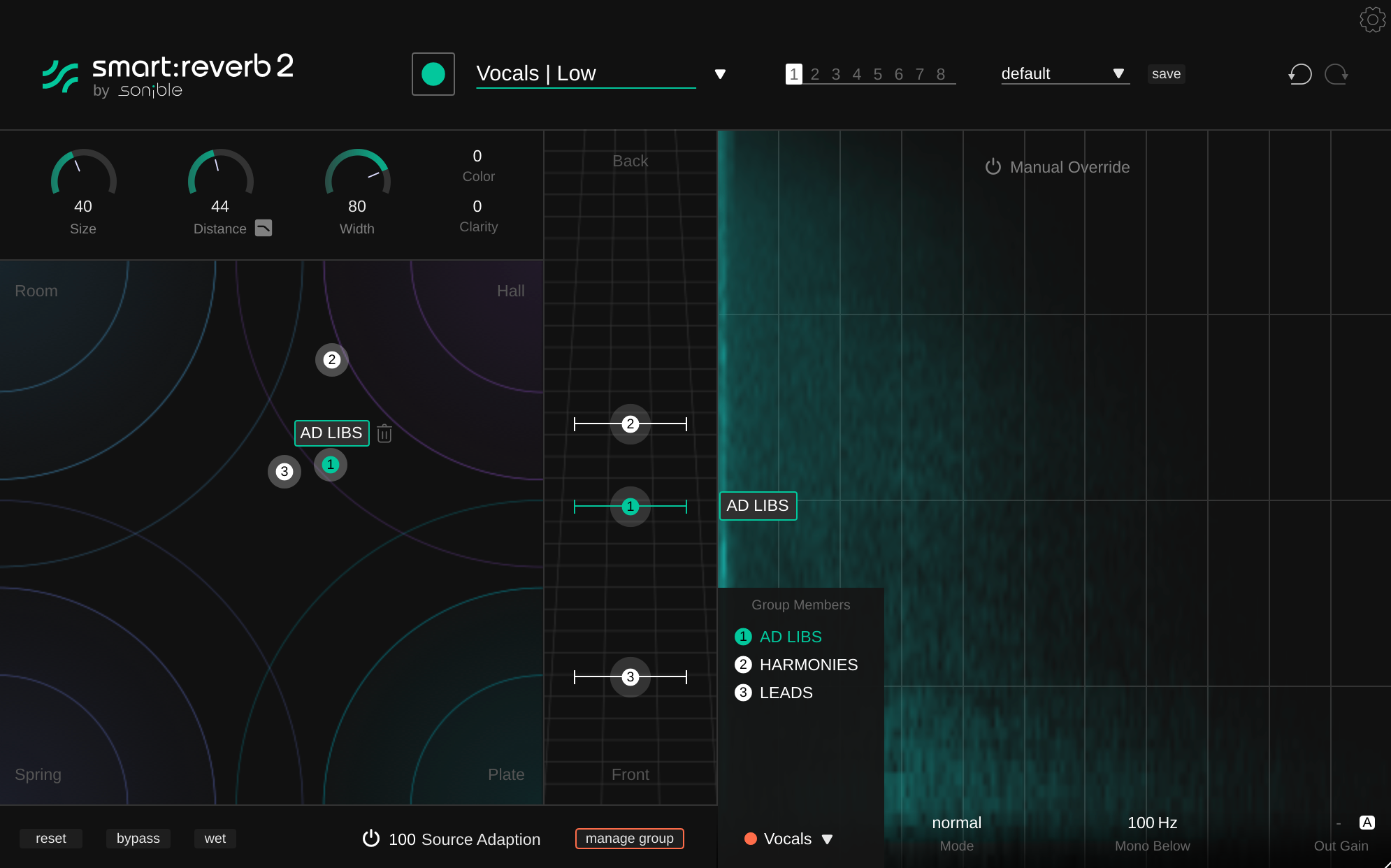 We place the Harmonies and Ad Libs further back, but keeping the harmonies wider, to contribute their energy around the stereo field.