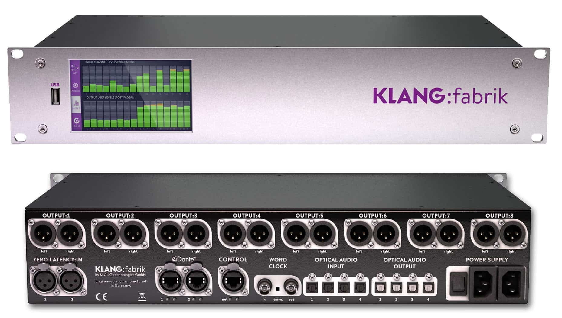 “KLANG:fabrik is the core of our monitoring solution. It combines the latest and finest HD audio algorithms with a multitude of flexible audio interfaces (i.e. MADI, Dante™, compatible to ADAT) in order to work with professional mixing desks and stage boxes of any kind. Up to 16 musicians receive their individual 3D mixes with one KLANG:fabrik. If your band needs more mixes, simply daisy-chain multiple devices.” – Pascal Dietrich, founder and spokesperson of KLANG:technologies on their flagship KLANG:fabrik.