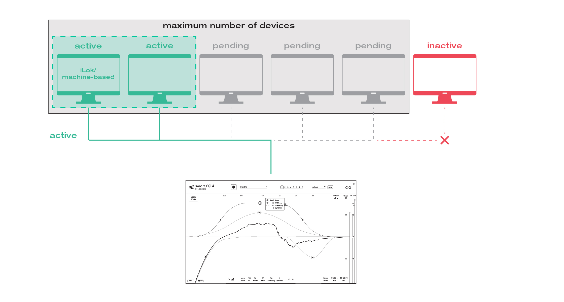 In total, two simultaneous activations are possible: Either 2 machine-based or 1 machine-based and 1 via iLok.