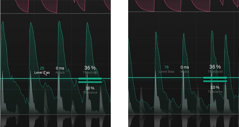 Die Form der Activity Function kann über den Level Bias beeinflusst werden. Der Level Bias legt fest, wie stark die Activity Function dem Gesamtsignalpegel des Zielsignals folgt. Ein höherer Wert eignet sich typischerweise gut für sehr dynamische Signale wie Schlagzeug.