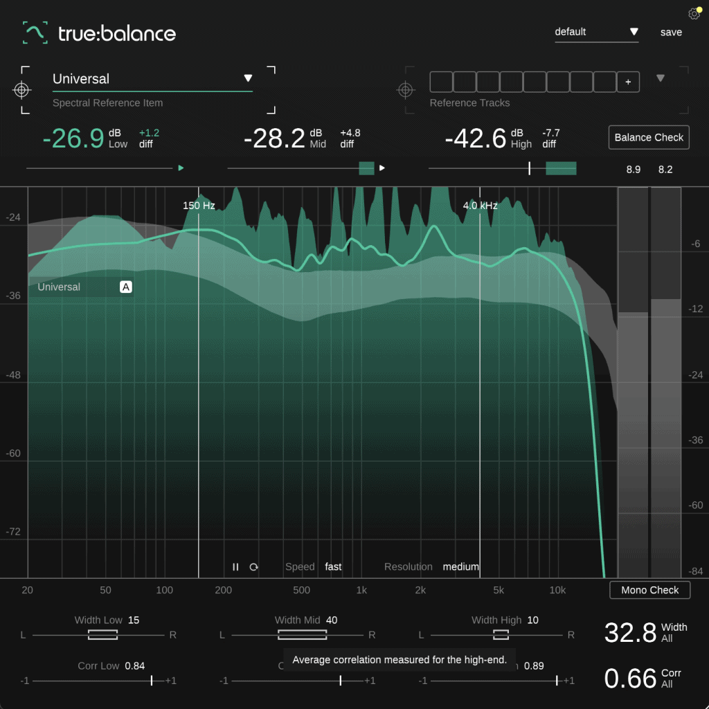 Niemand von uns hat immer eine perfekt kalibrierte Wahrnehmung der tonalen Balance eines Tracks. Darum gibt es Metering Tools wie true:balance, die uns detaillierte, objektive Einblicke ermöglichen. Mit dem Balance Check im Plug-in, das die spektrale Verteilung deines Signals analysiert und dir text-basierte Vorschläge basierend auf der gewählten Referenz macht, kannst du deinen Track gezielt verbessern.